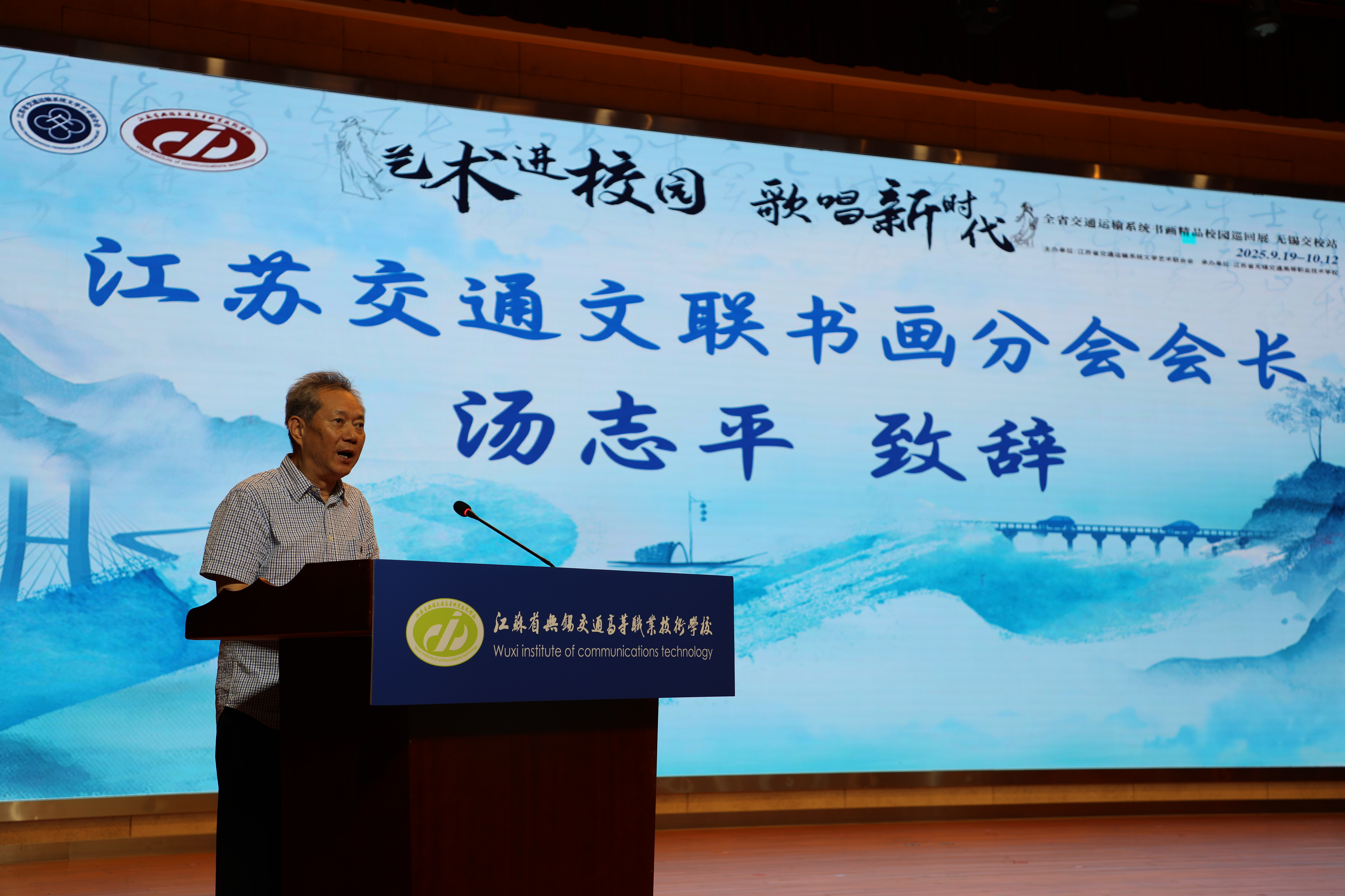 為深入學習習近平文化思想,推動文化育人與詩畫藝術深度融合,9月19日上午,“藝術進校園·歌唱新時代”全省交通運輸系統(tǒng)書畫精品校園巡回展走進江蘇省無錫交通高等職業(yè)技術學校。江蘇省交通運輸廳原黨組成員、副廳長、江蘇交通文聯(lián)會長金凌,省交通運輸廳原二級巡視員、機關黨委書記,江蘇交通文聯(lián)副會長陳萍,省交通運輸廳原二級巡視員、江蘇交通文聯(lián)副會長兼秘書長黃巖,江蘇交通文聯(lián)執(zhí)行秘書長、作家分會會長陸新民,江蘇交通文聯(lián)書畫分會會長湯志平,學校黨委書記李進等領導出席活動。江蘇交通文聯(lián)相關負責同志、學校領導班子成員、各部門負責人以及師生代表參加活動并參觀書畫展。活動由學校校長耿興華主持。